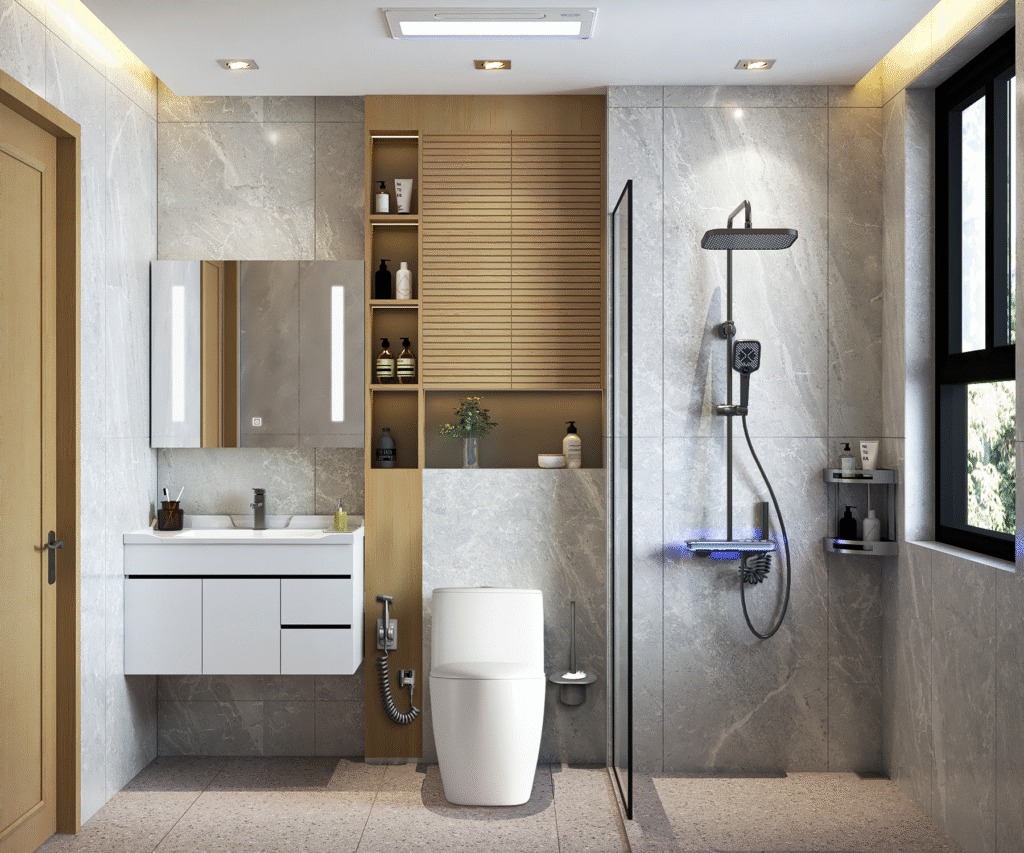 - 3. Thiết kế khô – ướt rõ ràng: Khu vực tắm cần có vách kính hoặc rèm ngăn để không làm ướt toàn bộ sàn. Điều này giúp nhà vệ sinh luôn sạch sẽ, bền lâu và an toàn với trẻ nhỏ, người lớn tuổi.