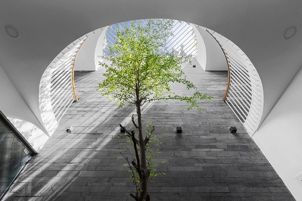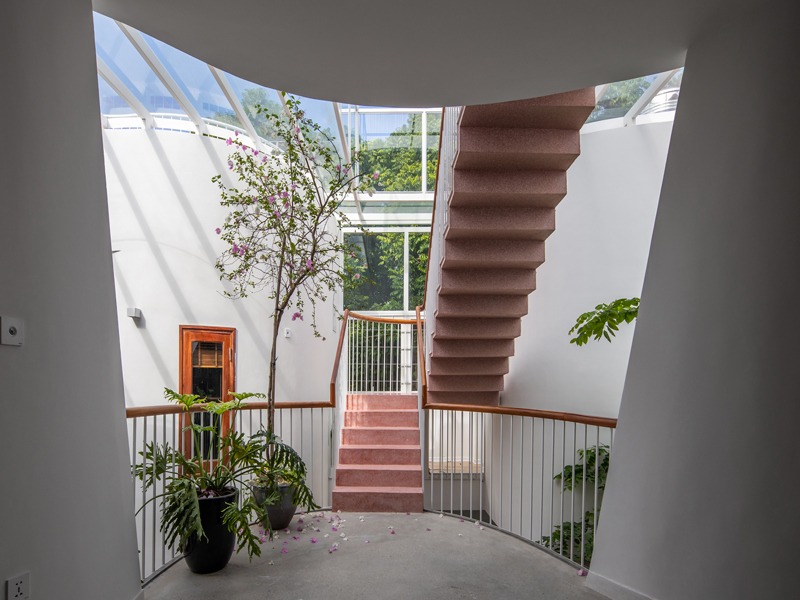 - Kết hợp cầu thang: Thiết kế giếng trời ôm lấy khu vực cầu thang để tận dụng không gian di chuyển và đối lưu khí.